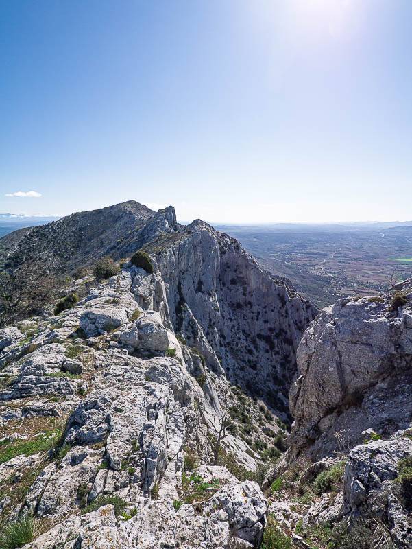 Au sommet du Pic des Mouches, le parcours de crête depuis le Col de Vauvenargues par le Baù de l'Aigle. Plus loin, le Baù des Vespres et la Croix de Provence à l'horizon (Provence, Vauvenargues, Bouches-du-Rhône – 23/04/12)