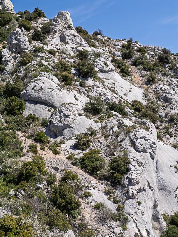 Le sentier évite le pierrier raide et instable au pied du Couloir des Justiciables sous le Col de Vauvenargues (Provence, Puyloubier, Bouches-du-Rhône – 23/04/12)