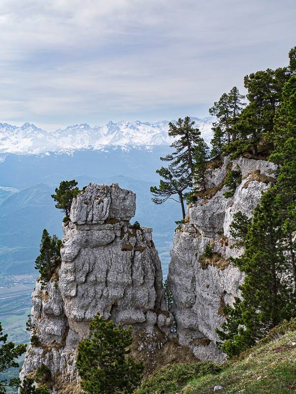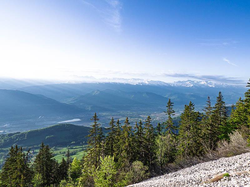 En s'élevant dans le raide pierrier, la vue se dégage rapidement sur le Grésivaudan et le Massif de Belledonne (Chartreuse orientale, Sainte-Marie-du-Mont, Isère - 15/05/12)