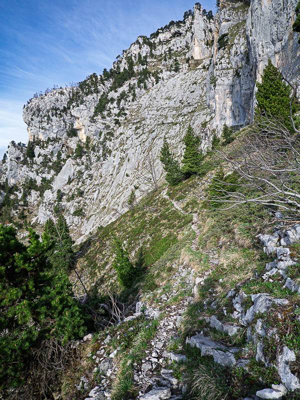 Depuis le parking, la longue traversée en courbe de niveau qui conduit au pierrier sous le Trou de la Rousse, est agréablement fleurie. Aux fleurs printanières, s'ajoute le plaisir de parcourir sans difficulté, le chemin qui peut être qualifié de sec. Bientôt à la bifurcation, la pente du pierrier plutôt instable rappelle la question : y aller ou pas ? À pas mesurés, posés avec soin pour ne pas glisser, le dénivelé se grignote lentement.