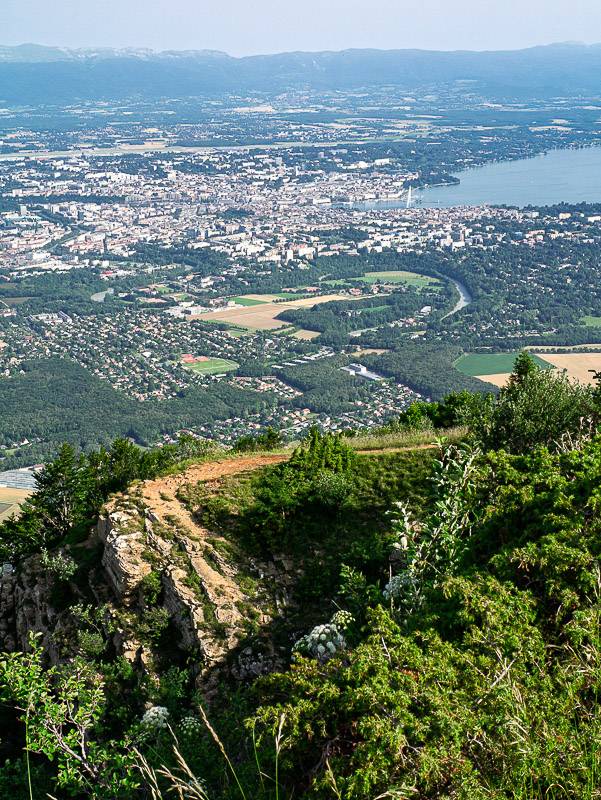 Un escalier face à la gare qui contourne une buvette, donne accès au chemin, bien indiqué et balisé. La table d'orientation est toujours indiquée, mais arrivé sur place, il faudra se satisfaire du rocher taillé qui servait de support. La plaque a disparu et le site semble à l'abandon. Plus loin, l'aire d'envol des parapentes permet de s'abandonner quelques instants à la contemplation de la ville de Genève au bord du Lac Léman. Au bord des falaises abruptes sous le relais télévision, la vue est saisissante dans une ambiance plus naturelle.
