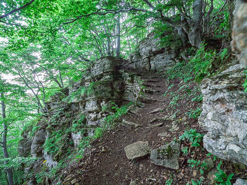 Signe d'un passage ancestral, des marches sur le sentier en remblai soutenu par un muret de pierres sèches (Salève, Collonges-sous-Salève, Haute-Savoie – 30/06/12)