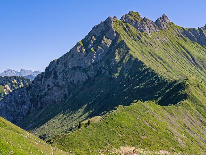 Devant le versant Est de la Pointe de Chavasse, le pointement rocheux élancé, sans nom sur la carte et le Col de Vésinaz au premier plan (Chablais, Mieussy, Haute-Savoie – 17/08/12)