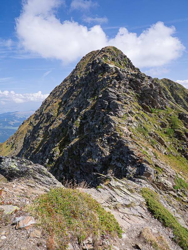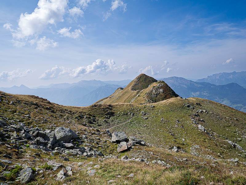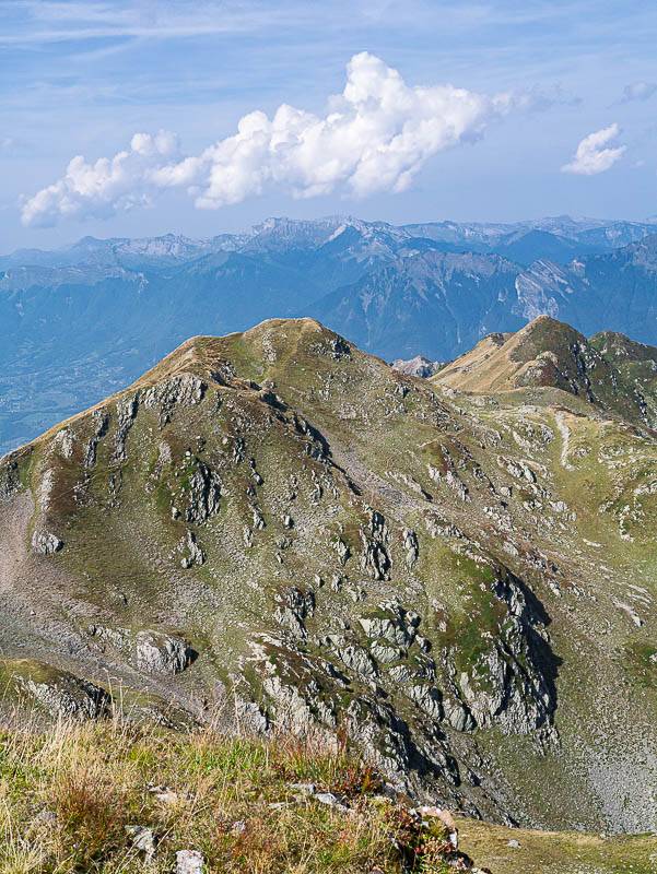 Une pause brève permet d'avaler une barre énergétique. En apercevant le Mont Mirantin dans le lointain brumeux, il y en aura besoin. Le Mont Blanc se devine à peine au travers du voile laiteux. La crête présente des passages étroits escarpés qui demandent de l'attention. Et puis, la descente commence. Perdu dans mes pensées, je manque la sente qui va suivre la crête. En rouspétant, je poursuis la descente avec la cosse de remonter quelques dizaines de mètres. La flemme coûtera 150 mètres de dénivelé supplémentaire ! Il suffisait de compter les courbes de niveau sur la carte pour se motiver…
