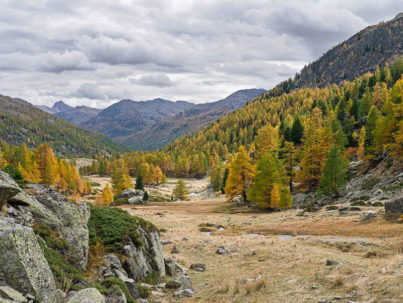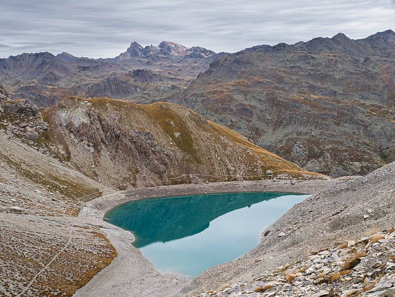 La sente dévale ainsi vers le Lac des Béraudes. La tâche émeraude foncée du lac, tranche dans le paysage presque monochrome sous le ciel gris. Le Mont Thabor occupe l'horizon. En courts lacets, le sentier est tracé dans la pente raide jusque vers 2300 mètres. Enfin le paysage s'adoucit. Les mélèzes en robe d'automne, éclairent la haute vallée de la Clarée sous quelques rares rayons de soleil.