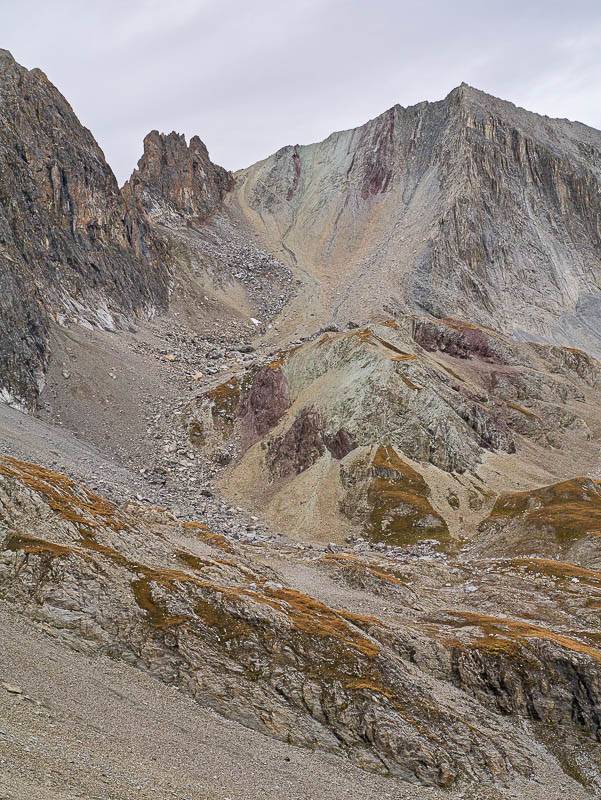 Le sentier reste bon jusque dans le pierrier de schistes sous la crête. La trace boueuse monte en écharpe jusqu'à une sorte de fissure, couloir dans l'arête secondaire issue d'un gendarme caractéristique, qui plonge dans la pente. Le passage est glissant, et par une traversée exposée sur une trace étroite à peine marquée dans le sol glissant, le Col est atteint. L'empreinte profonde des chaussures se remplit d'eau… La terre du col est gorgée de l'eau de la pluie de la nuit et de la fonte de la neige tombée récemment.