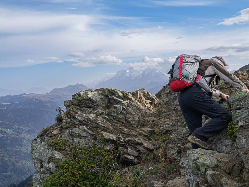 Passage escarpé et exposé sur la crête sommitale de la Roche Pourrie, le Mont Blanc à l'horizon (Beaufortain, Queige, Savoie – 22/10/12)