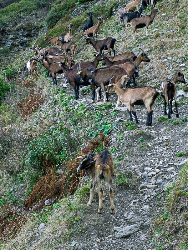Une quarantaine de chèvres curieuses occupe le sentier en amont du Haut du Pré (Beaufortain, Albertville, Savoie – 22/10/12)