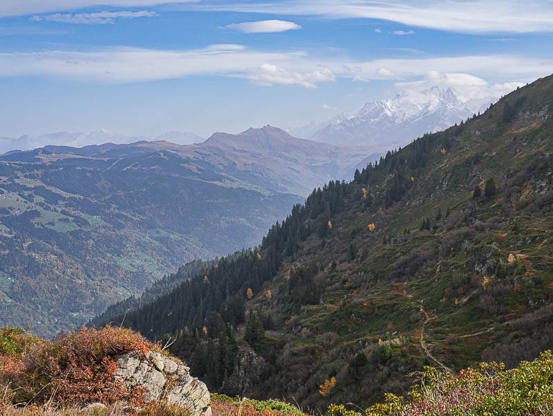 Point de vue sur le Mont Blanc encombré de nuages tenaces dans la descente de la Roche Pourrie (Beaufortain, Queige, Savoie – 22/10/12)