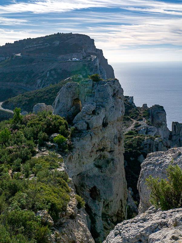 En montagnes russes, le parcours passe par la borne du point 394 qui marque le point culminant de la randonnée. Le panorama sur les Calanques et la Baie de Cassis est superbe et chaque fois que cela est possible, il ne faut pas manquer de se rapprocher du bord vertigineux des Falaises Soubeyranes pour varier l'angle de vue – cependant, prudence par grand vent…