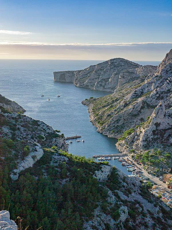 Le sentier orienté grosso modo vers le Sud va bientôt poursuivre la descente par la rive gauche de la calanque. Dès lors la vue dominante sur Morgiou capte le regard. Le point de vue est superbe. la courte descente d'un raide ressaut rocheux facilitée par une solide chaîne [ 31T 0698578 4787407 ] précède un parcours merveilleux qui domine le petit port de pêche de la calanque.