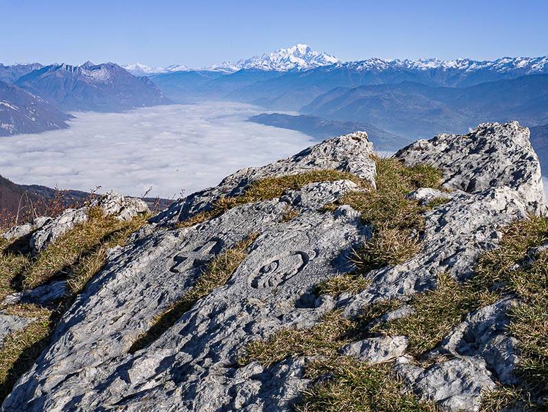 Avec le Mont Blanc en toile de fond, la magnifique borne n°20 de la frontière franco-sarde de 1822 gravée sur une dalle de la crête du Grand Manti vers 1800 mètres (Chartreuse orientale, Sainte-Marie-du-Mont, Isère – 16/11/12)