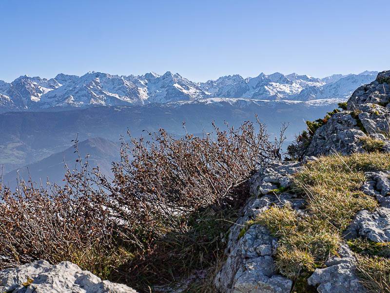 Au delà de la vallée du Grésivaudan, la crête presque horizontale du Grand Rocher précède la chaîne de pics du Massif de Belledonne (Chartreuse orientale, Sainte-Marie-du-Mont, Isère – 16/11/12)