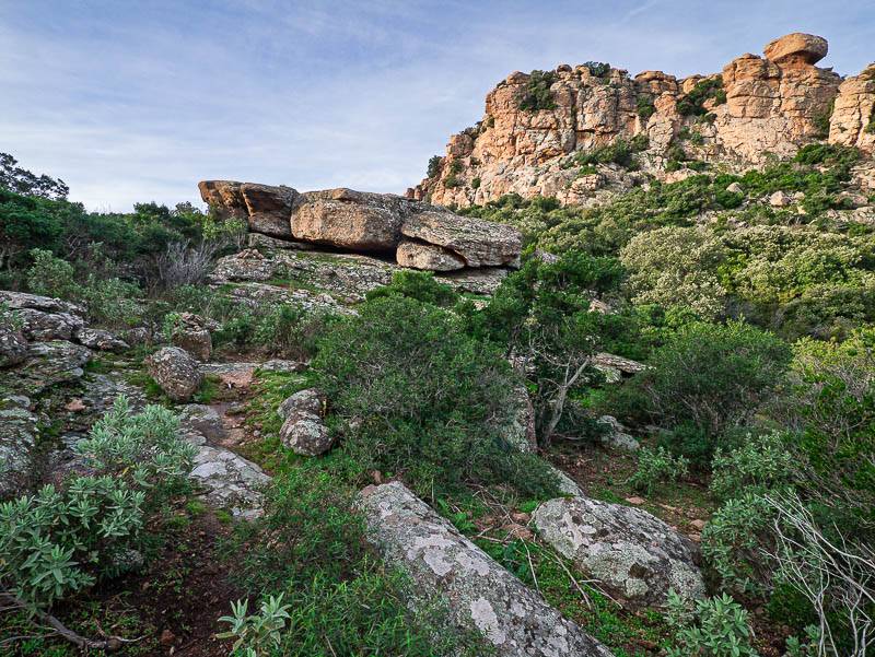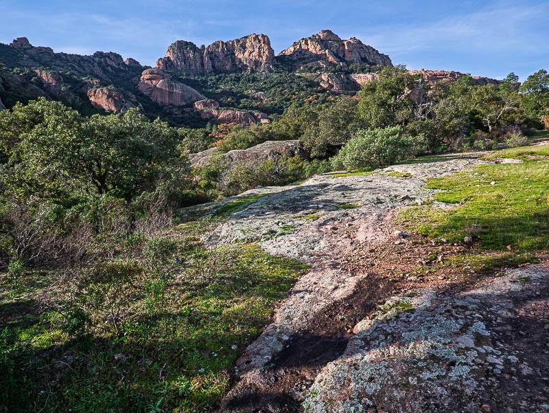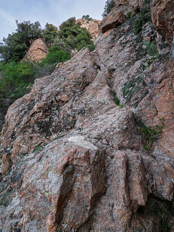 Passage de dalles dans l'ascension du Rocher de Roquebrune. La vue dégagée permet d'apprécier l’environnement caractéristique de ce secteur (Les Maures, Roquebrune-sur-Argens, Var – 23/12/12)