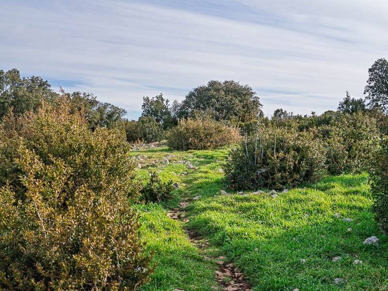 Le plateau est caillouteux, quelques petites fleurs colorent l'herbe. Et dans la lumière, en progressant vers le Sud, le vert printanier de l'herbe retient le regard – l'espoir d'en finir avec l'hiver interminable cette année. Déjà vers la crête, un raccourci conduit à la descente du Vallon de la Brayette [ 31 T 670542 4854730 ]. Continuer le sentier permet de dominer les vallons du Colombier et de la Taverne, typiques des paysages du Petit Luberon, comme le confirme un court aller et retour depuis le sentier du Vallon de la Brayette.