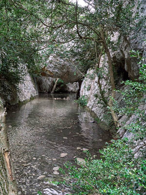La promenade commence en cherchant bientôt les bords plus à secs ou les pierres, comme un gué pour ne pas mouiller les chaussures. L'ambiance est exceptionnelle, le chant des oiseaux raisonne entre les parois.