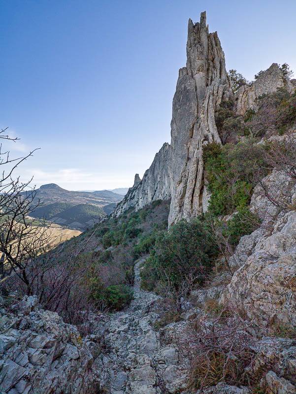 Vers l'Est, la Brèche Florets-Turc permet l'observation des strates verticales qui forment la fine arête rocheuse des Dentelles (Dentelles de Montmirail, Beaumes-de-Venise, Vaucluse – 21/03/13)