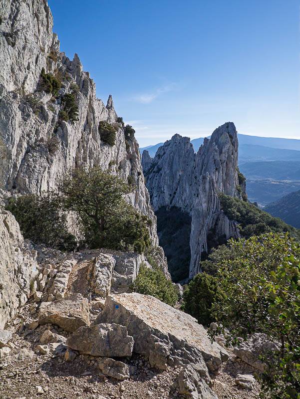 Plus qu'il n'en faut pour l'écrire, le sentier débouche déjà par des passages plus rocheux dans la Brèche Florets-Turc. La vue sur les strates verticales des Dentelles Sarrasines est saisissante. Mais que viennent faire les Turcs et les Sarrasins dans la toponymie ?