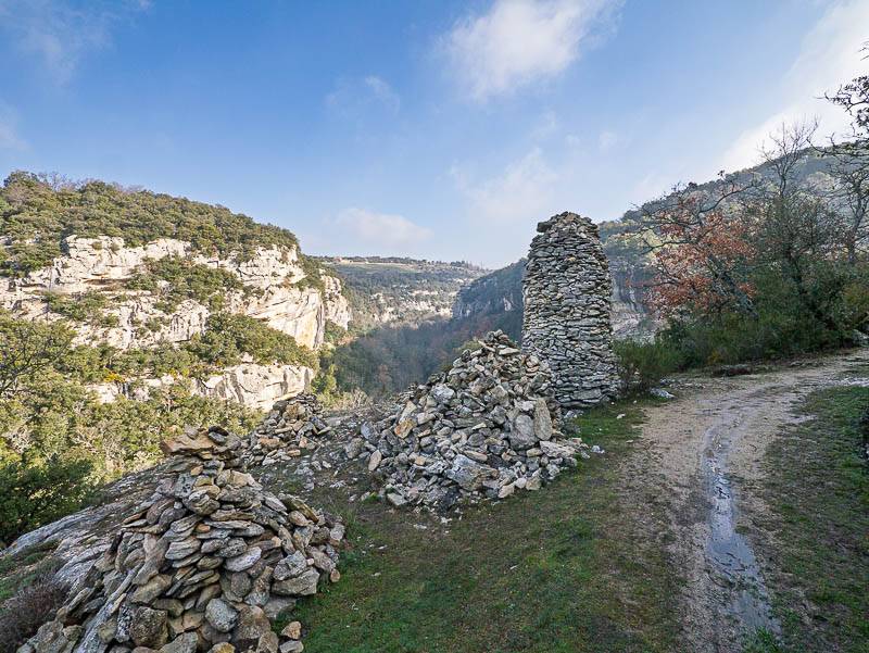 La rivière traversée, le sentier monte en direction du Ravin de l'Enfer trouver le chemin de Chantebelle. Sous le Clap, il contourne la montagne en passant par un replat où est érigé un beau et haut cairn de pierres sèches. Que marquait-il ? Plus contemporains, plusieurs tas de pierres ont été dressés par les passants – un cimetière de cairns.