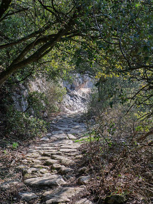 Caladé et bordé d'un muret de pierres moussues, le chemin passe le fond de la combe pour monter vers le village. La proximité de nombreux bancau dans la pente a multiplié les embranchements. Alors un peu d'attention permettra de ne pas s'égarer, surtout que le balisage est pour le moins hasardeux à cet endroit.