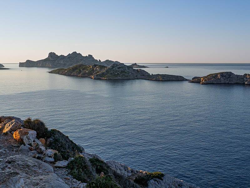 Faut-il rappeler l'accès au port de Callelongue ? Par la Pointe Rouge dans Marseille, Montredon, puis les Goudes pour trouver une place où laisser la voiture à Callelongue. De bon matin, c'est encore facile, même sur l'avenue des Pebrons entre les cabanons [ 31T 0691275 4787191– N 43.21327° E 5.35481° ]. Une nouvelle fois, le sentier de la douane est parcouru au lever du soleil par une lumière rasante qui réveille le paysage. Un moment trop bref, l'Île Maïre se pare d'or…