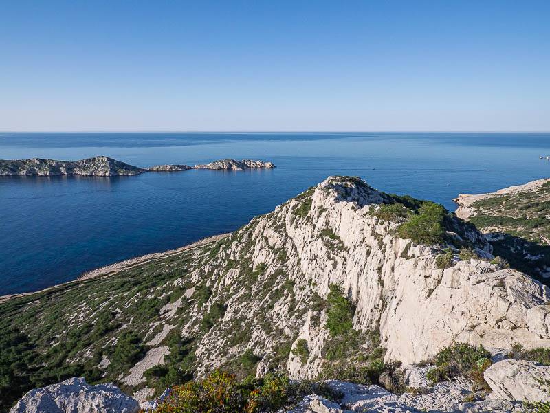 En contrebas, la flemme empêche la courte remontée pour visiter la Grotte de l'Ours. Une terrasse-belvédère est atteinte par le sentier jalonné de vert. Elle précède une traversée rocheuse, facile mais exposée qui conduit sous la vaste Grotte de l'Ermite. Et la descente file sous les Lames et le Rocher des Goudes pour dévaler vers Callelongue et l'avenue des Pebrons. Les nombreux vallons au Sud du Massif de Marseilleveyre méritent de s'y attarder…, d'y revenir.