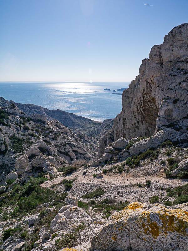 La Roche Percé de la Mounine est encore un mystère, rien dans le paysage n'a révélé l'existence d'une arche ou d'un trou dans les rochers de la crête qui s'effile. Encore une raison de revenir traîner dans ce coin des Calanques. Mais le Pas inférieur de la Mounine, lui est bien réel…