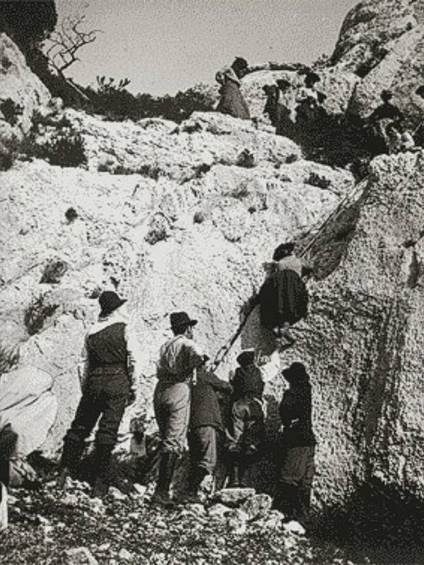 Un groupe d'excursionnistes à la corniche de la Mounine dans les calanques ; une femme escalade un rocher. Source : Attard-Maraninchi, Marie-Françoise. « Les photographies des Excursionnistes marseillais, témoignage d’une conquête de la Provence (1897-1914) » – Imageson.org.