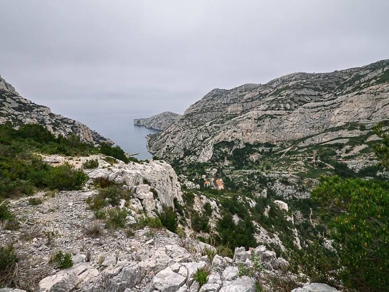 Le raidillon est vite remonté, mais plutôt que d'aller jusqu'au sentier, il est préférable de couper par un replat pour retrouver le bord de la falaise et le suivre. De là, d'un côté la Roche Percée de Morgiou s'intègre dans son environnement de falaises abruptes, de l'autre la Calanque de Morgiou s'ouvre sur le large, bordée par le Cap éponyme. La visite est terminée. La randonnée peut se poursuivre vers la Calanque de Sugiton en profitant de la beauté des lieux.
