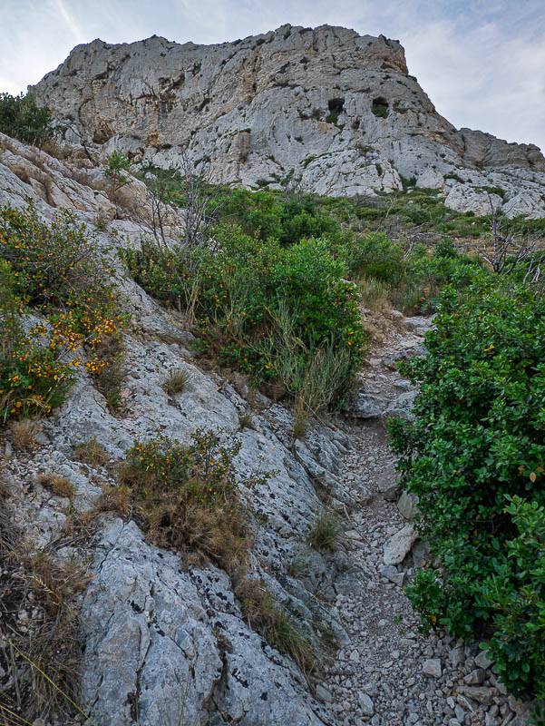 Depuis le Vallon de l'Homme Mort, le sentier monte sous la Grotte Dechaux (Calanques, Sormiou, Marseille 8ème, Bouches-du-Rhône – 13/06/14)