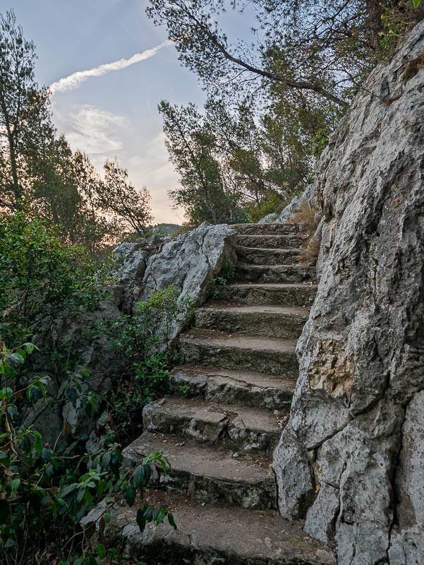 De la barrière DFCI du Boulevard de la Grotte Rolland, la randonnée commence par rejoindre le chemin pittoresque des escaliers de la crête boisée qui offre une alternative agréable au parcours du Vallon des Trois Gancets [ 31T 0692417 4789334 ]. Le sentier ancestral, n'est curieusement mentionné que sur les cartes récentes. Que desservait-il ?