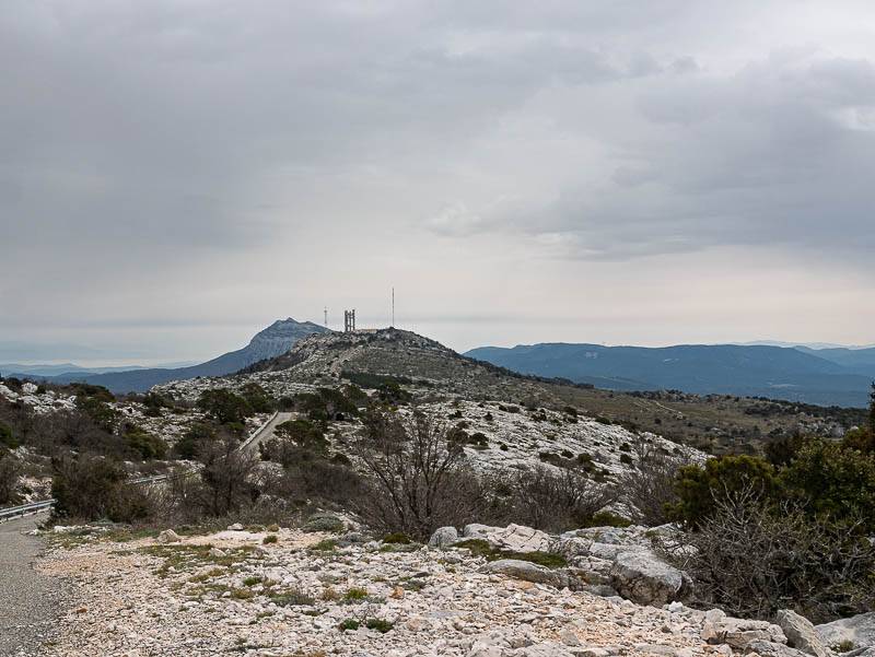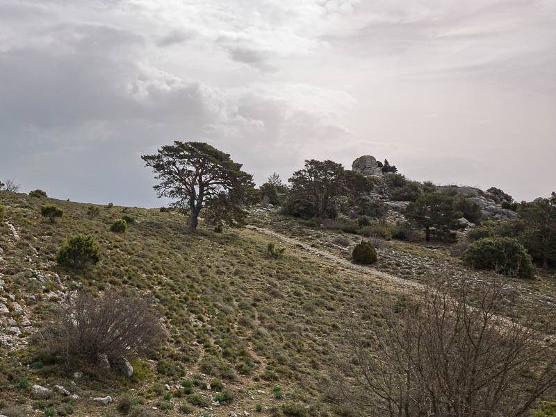 En prenant de l'altitude, le paysage devient garrigue, et l'air plus vif, éloignera la nuisance suceuse de sang. La courte averse essuyée au parking n'est plus qu'un mauvais souvenir. Le soleil pousse ses rayons à travers l'épaisse couverture nuageuse.